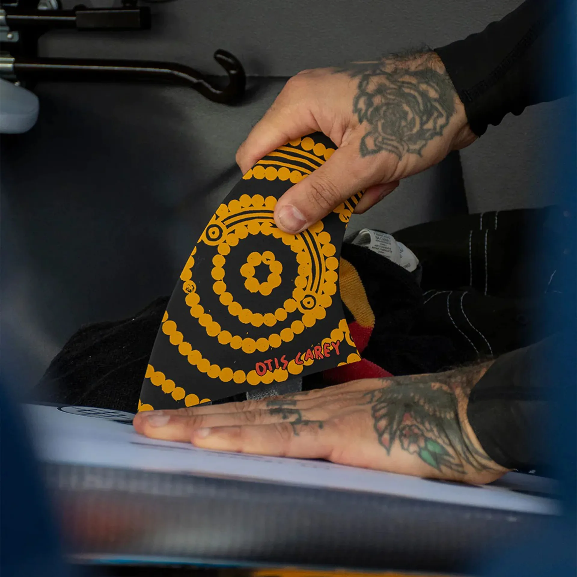 The artwork on the pad and the fin… It’s my interpretation of tides and how a full moon high tide goes right up the river.– Otis Carey